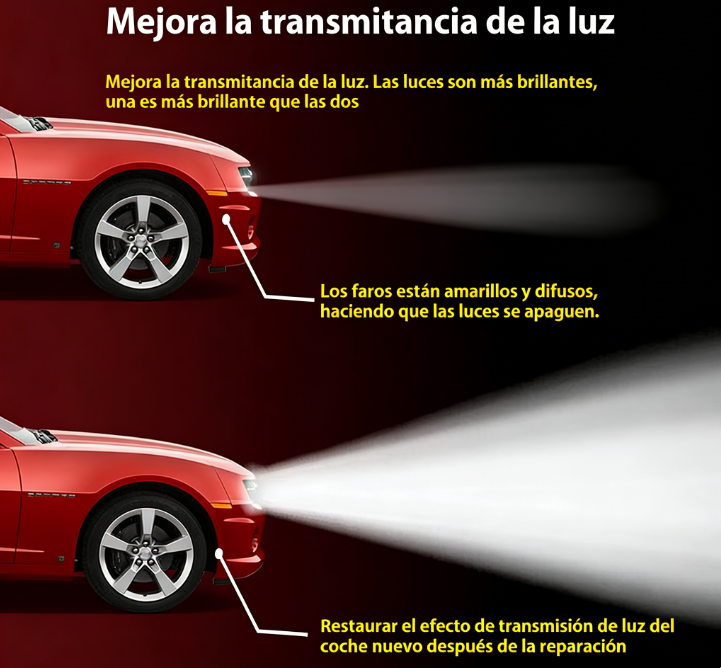 Protección de Larga Duración: Forma un recubrimiento duradero y resistente a los rayos UV para prevenir futuros empañamientos y mantener los faros claros durante meses.